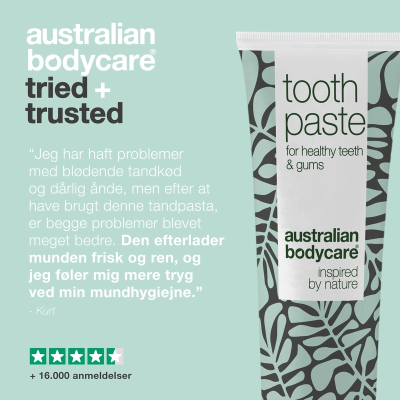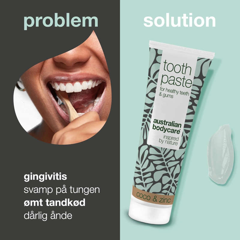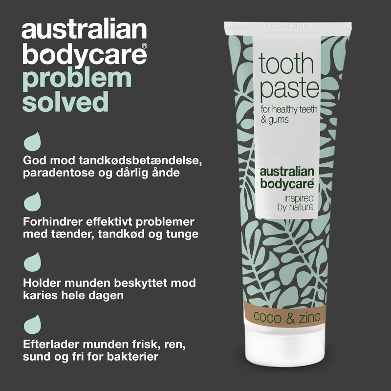 Australian Bodycare Tooth Paste Coco & Zinc är en tandkräm som passar särskilt bra för dig som vill skydda tänder och tandkött naturligt och skonsamt. Denna tandkräm innehåller zink, som verkar antibakteriellt, samt fluor som skyddar mot karies och tandsten, och kan användas för daglig vård av tänder, tunga och tandkött. Munnen lämnas ren, fräsch och fri från bakterier. Om du vill stärka din munhygien, förebygga dålig andedräkt eller lider av blödande tandkött eller tandköttsproblem, då är Australian Bodycare Tooth Paste Coco & Zinc precis grejen för dig. Fördelar: - Tandkräm - Skyddar tänder och tandkött - För daglig vård av tänder, tunga och tandkött - Ger en fräsch och ren känsla - Antibakteriell - Skyddar mot karies och tandsten - Lämnar munnen ren - Hjälper mot tandköttsproblem - Dermatologiskt testad - Vegan Användning: - Använd två gånger dagligen med en tandborste Ingredienslista: Sorbitol, Aqua/Water, Hydrated Silica, Xylitol, Sodium C14-16 Olefin Sulfonate, Arom/Smak, Melaleuca Alternifolia (Tea Tree) ) Lövolja, cellulosagummi, Cocos Nucifera (kokos)olja, natriumfluorid, natriumsackarin, zinkklorid, limonen.