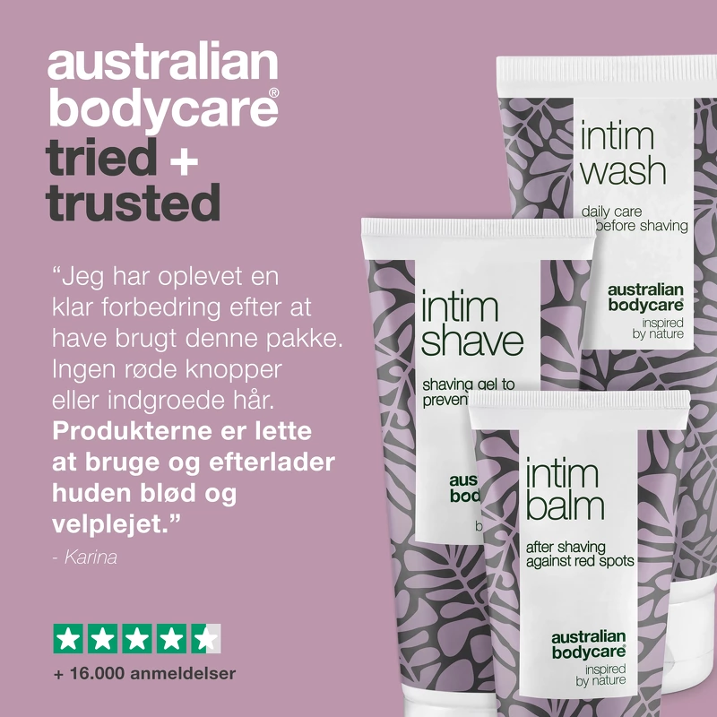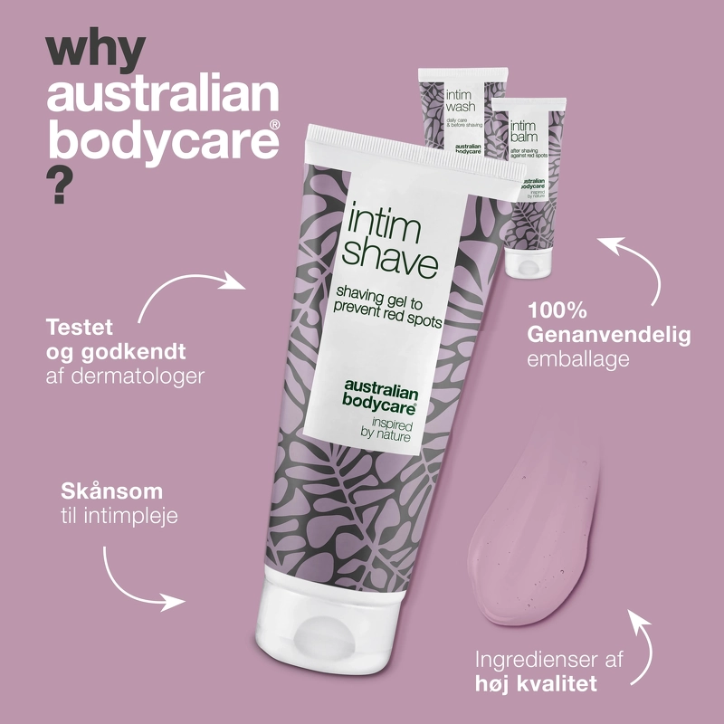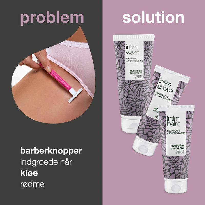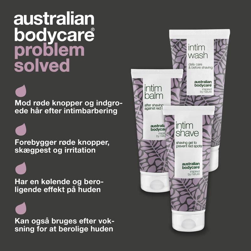 Australian Bodycare 3 Shaving Products är en kombination av 3 produkter, som alla arbetar för att minimera irritation, klåda, röda knölar och inåtväxande hår genom intim rakning. Så om det här är problem du kämpar med, då är detta paket det perfekta valet för dig! Setet innehåller: - 1 del. [Australian Bodycare Intim Wash 200 ml] (https://nicehair.dk/australian-bodycare-intim-wash-200-ml.html) - 1 del. [Australian Bodycare Intimate Shave 100 ml] (https://nicehair.dk/australian-bodycare-intim-shave-100-ml.html) - 1 del. [Australian Bodycare Intimate Balm 100 ml] (https://nicehair.dk/australian-bodycare-intim-balm-100-ml.html)
