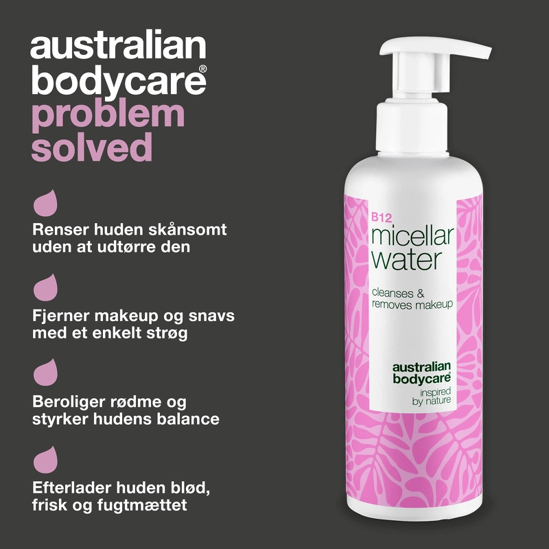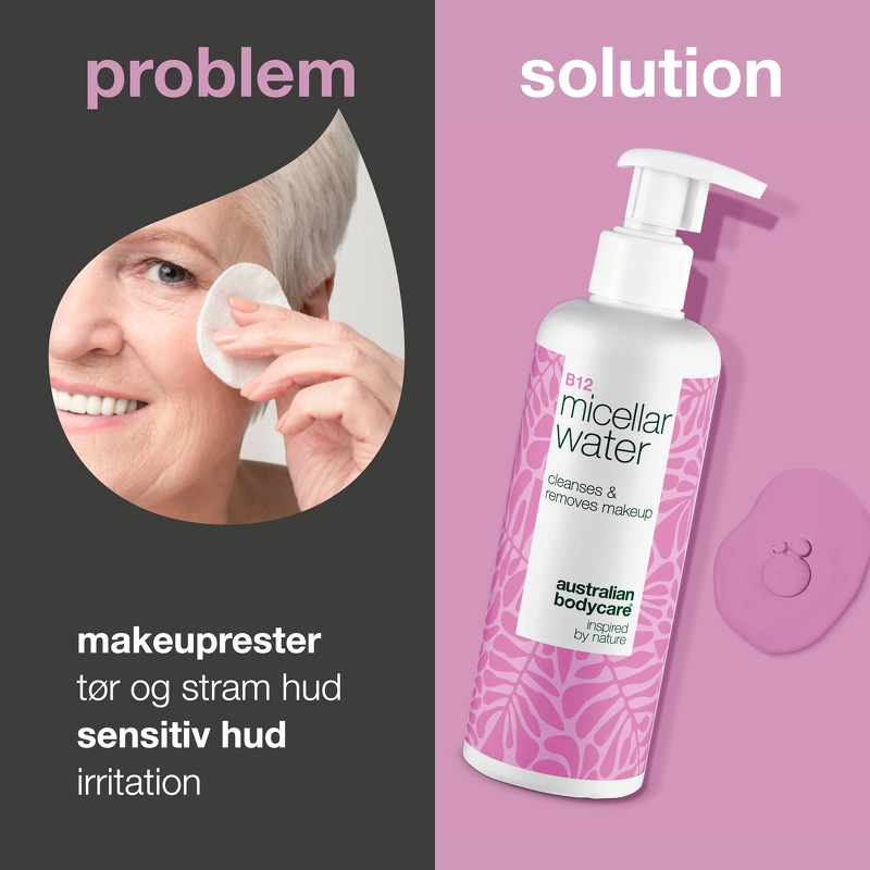 Australian Bodycare B12 Micellar Water är ett micellärt vatten med vitamin B12 – Mild, återfuktande och lugnande ansiktsrengöring för känslig och torr hud. Känns din hud stram, irriterad eller torr efter rengöring? Är du trött på rengöringsprodukter som torkar ut huden och lämnar den röd och obekväm? Du är inte ensam. Många kvinnor upplever att vanliga rengöringsprodukter stör hudens balans – särskilt om huden är känslig eller mogen. Det kan vara frustrerande, särskilt när du bara vill ha ett enkelt och effektivt sätt att rengöra huden utan att kompromissa med fukt och komfort. Detta micellärvatten är inspirerat av naturen och formulerat med aktiva ingredienser som arbetar tillsammans för att skonsamt rengöra huden samtidigt som det ger den näring och återfuktar. Det är inte bara ytterligare en rengöring – det är en del av din dagliga hudvård som hjälper till att lugna, återfukta och skydda huden. Den är perfekt för dig som har känslig, torr eller mogen hud och vill ha en snabb och effektiv rengöring utan användning av vatten – och utan att kompromissa med hudens välbefinnande. Fördelar: - Micellärt vatten - Lugnar och ger näring åt huden med vitamin B12 och niacinamid - Minskar rodnad, ojämn hudton och irritation - Tillför och binder fukt, så att huden känns mjuk och återfuktad - Mild, parfymfri formula för känslig hud - Tar bort smink och orenheter snabbt utan att skölja av Användning: - För att få ut det mesta av ditt Micellärt vatten med vitamin B12 rekommenderar vi att du använder produkten som det första steget i din hudvårdsrutin - både morgon och kväll. Den milda formulan gör det enkelt och snabbt att rengöra huden effektivt utan att störa hudens naturliga balans. - Skaka flaskan lätt före användning, vid behov. - Fukta en bomullsrondell med micellärvattnet - den ska vara fuktig, men inte droppande. - Torka försiktigt över ansikte, ögon och hals. Undvik att gnugga hårt - produkten gör jobbet åt dig. - Upprepa med en ren bomullsrondell om mer smink eller smuts behöver tas bort. - Produkten behöver inte sköljas av – huden är nu ren och redo för serum, kräm eller annan hudvård. Ingredienslista: Vatten Propandiol Butylenglykol Niacinamid Glycerin Cyanokobalamin Fenoxietanol PEG-7 Glycerylkokoat Kaprylylglykol Tetranatriumiminodisuccinat * Citronsyra.