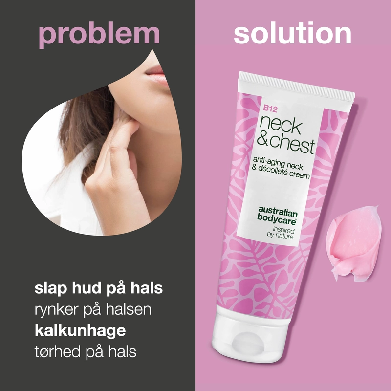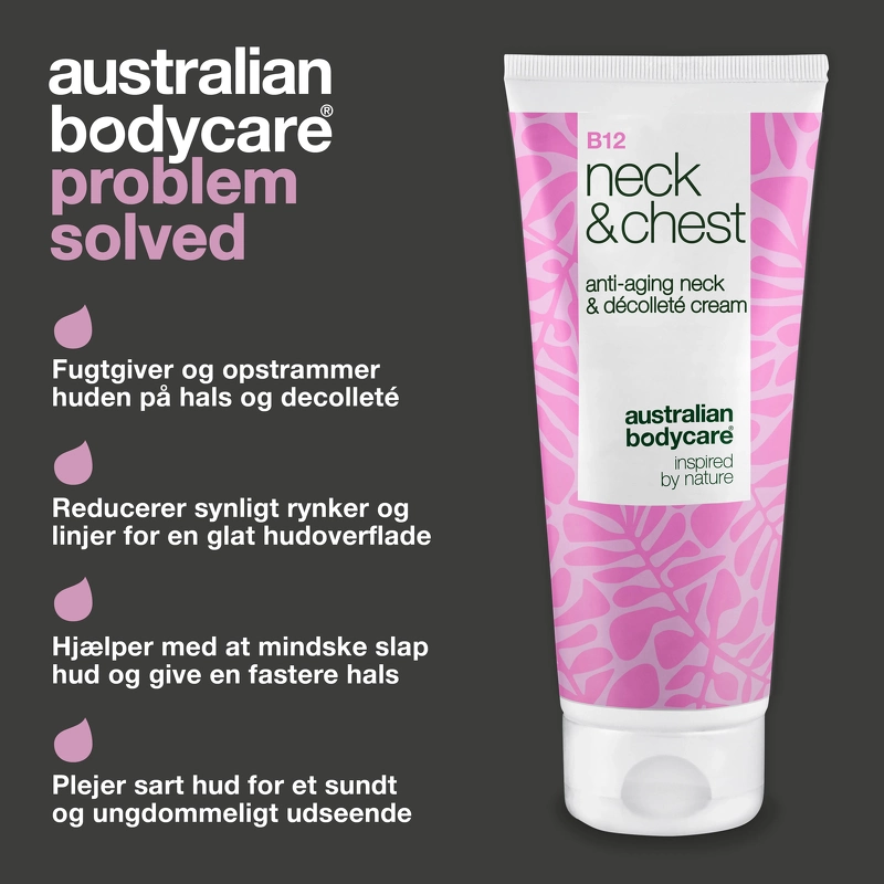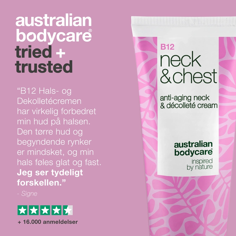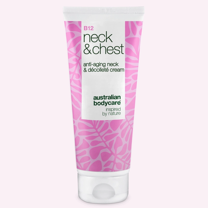 Australian Bodycare B12 Neck & Chest är en effektiv kräm som stärker din hals och bröstkorg med fukt, näring och en uppstramande effekt. Kämpar du med slapp hud på hals och bröstkorg, synliga rynkor eller en kalkonhaka som du vill minska? Vitamin B12 Neck & Décolletage Cream har utvecklats för att strama upp och föryngra huden i hals- och dekolletageområdet. Denna kräm är den perfekta lösningen för dig som vill ge sin hud extra vård och fukt så att den kan behålla sitt ungdomliga utseende. Med en kraftfull blandning av vitaminer, hyaluronsyra och peptider hjälper krämen till att förbättra hudens elasticitet, minska fina linjer och ge en hälsosam, jämn hudton. Resultatet är en slätare och strålande hud på hals och bröstkorg som ser naturligt fast och välvårdad ut. Så fungerar Vitamin B12 Neck & Décolletage Cream. Denna hals- och dekolletagekräm är fullpackad med aktiva ingredienser som arbetar tillsammans för att föryngra din hud och motverka ålderstecken. Vitamin B12 hjälper till att ge huden en energikick som främjar cellförnyelsen och skapar en mer ungdomlig lyster. De tillsatta peptiderna hjälper till att stärka hudens naturliga struktur och göra den fastare, medan hyaluronsyra binder fukt till huden och gör den mer smidig och elastisk. När du använder B12 Vitamin Neck & Décolletage Cream dagligen får huden på halsen och bröstet långvarig fukt och näring, vilket motverkar slapp hud och rynkor. Fördelar: - Kräm för hals och bröst - Uppstramande effekt - Stärker huden och minskar synligheten av slapp hud - Minskar rynkor och linjer - Återfuktar och gör huden silkeslen mjuk och elastisk - Jämnar ut hudtonen och minskar pigmentfläckar Användning: - 1. Rengör huden: Rengör hals och dekolletage med en mild rengöring och torka försiktigt. - 2. Applicera krämen: Massera försiktigt in i huden med uppåtgående rörelser. - 3. Absorption: Låt krämen tränga in innan du applicerar andra produkter eller kläder. - 4. Upprepa dagligen: Använd morgon och kväll för optimala resultat. - Tips: Exfoliera området varje vecka för bättre absorption och slätare hud. Ingredienslista: Vatten Pentaerytrityldistearat Glycerin Butyrospermum Parkii (Sheasmör) Niacinamid Cetearylalkohol Glycerylstearatcitrat Squalan Kapryl-/Kaprintriglycerid/Bärnstenssyra Glycerylstearat Crambe Abyssinica-fröolja Fytosterolestrar Hydrogenerad etylhexylolivat Palmitoyltripeptid-5 Acetyltetrapeptid-2 Cyanokobalamin Bakuchiol Ectoin Natriumhyaluronat Panthenol Solrosfröolja (Helianthus Annuus) Hydrogenerad olivolja Oförtvålbara ämnen Polyakrylat-tvärpolymer-6 Kaprylylglykol Tokoferol Beta-karyofyllen Fenoxietanol Tetranatriumiminodisuccinat Mjölksyra Parfym/Doftämne Lavandulaolja/extrakt Linalool Linalylacetat Karnosinsyra Santalol.