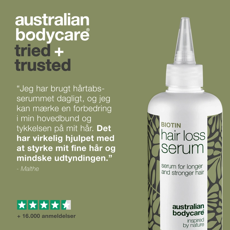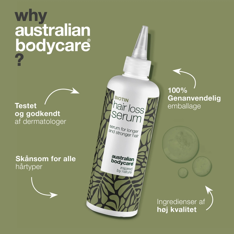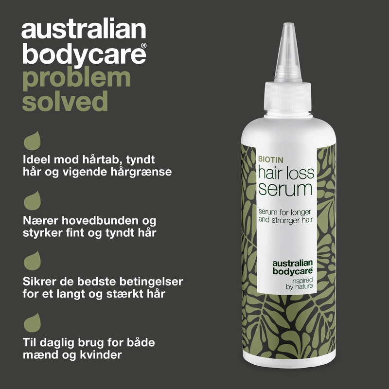 Australian Bodycare Hair Loss Serum är en produkt för dig som upplever håravfall med tiden. Många ser mer hår i hårbotten efter duschen – men som tur är finns det en lösning: Hair Loss-serien från Australian Bodycare. Serumet innehåller den naturligt aktiva ingrediensen Capilia Longa, som är kliniskt dokumenterad att kunna motverka håravfall. Tillsammans med Biotin, som stärker hår och hårbotten, ger serumet optimala förutsättningar för tjockare och friskare hår. Serumet ingår i ett 3-stegssystem, som även inkluderar Australian Bodycare Hair Loss Wash och Australian Bodycare Hair Loss Spray, och det rekommenderas att alla tre produkterna används dagligen för bästa resultat. Fördelar: - Serum mot håravfall - Stärker hårbotten och främjar hälsosam hårväxt - Ger de bästa förutsättningarna för tjockt och starkt hår - Skölj inte ur håret - Vegansk Användning: - Spraya serumet direkt i hårbotten - Skölj inte ur - Använd vid behov serumet på kvällen så att det kan verka över natten - Rekommenderas att använda tillsammans med Hair Loss Wash och Hair Loss Spray Ingredienslista: Aqua/Water, Alcohol Denat., Butylene Glycol, Curcuma Longa (Turmeric) Callus Conditioned Media, Niacinamide, Phenoxyethanol, Glycerin, Panthenol, Polyacrylate Crosspolymer-6, Koffein, Biotin, Caprylyl Glycol, Natriumhydroxid, Gluconolactone, Citric Acid, Tasmannia Lanceolata Fruit/Leaf Extract, Sodium Benzoate, Terminalia Ferdinandiana (Kakadu Plum) Fruit Extract, Calcium Gluconate.