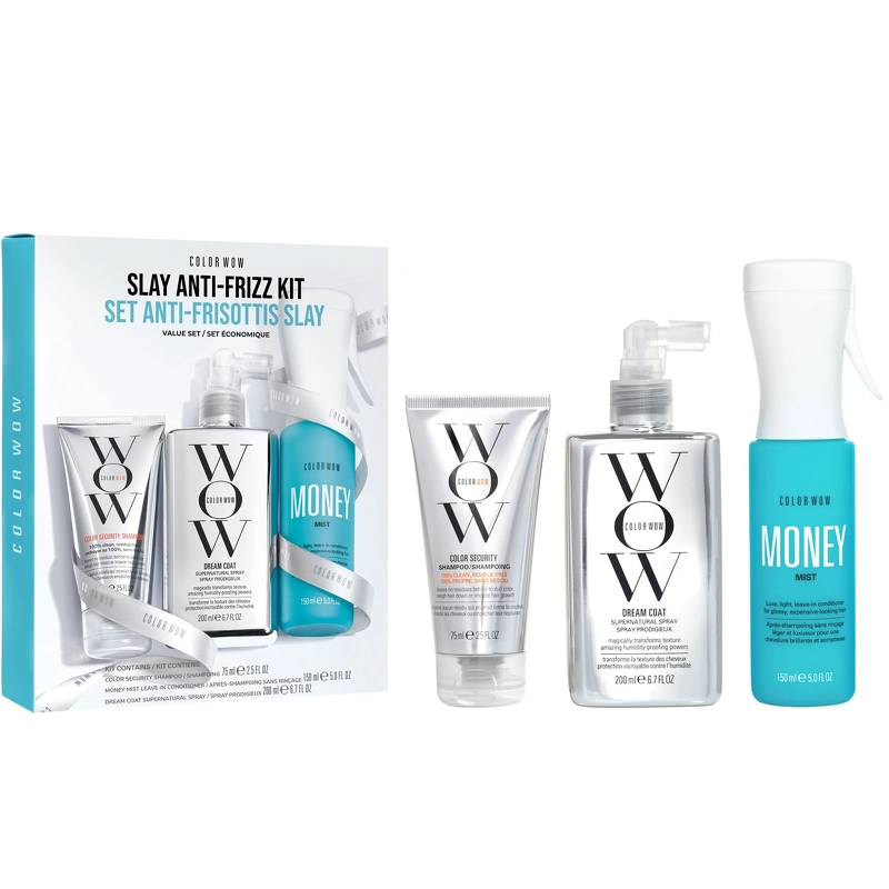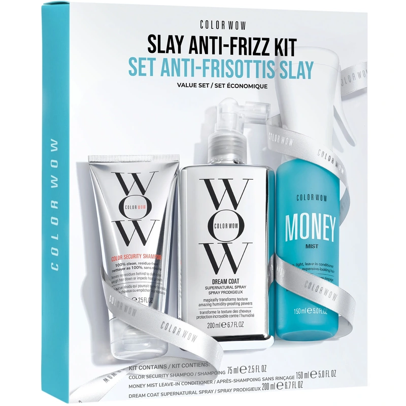 Color Wow Slay Anti-Frizz Kit är en presentask med hårprodukter som är perfekt för dig som vill ha antingen en mjuk, elegant look eller full volym som varar hela dagen. Setet innehåller: - 1 st. Color WOW Money Mist 150 ml - 1 st. Color Wow Dream Coat Supernatural Spray 200 ml - 1 st. Color WOW Color Security Shampoo 75 ml