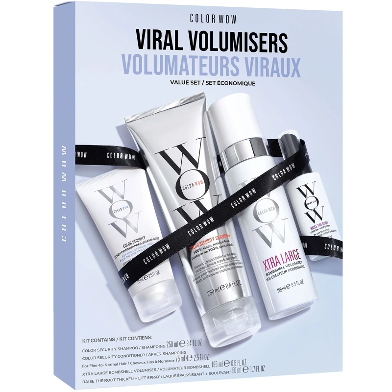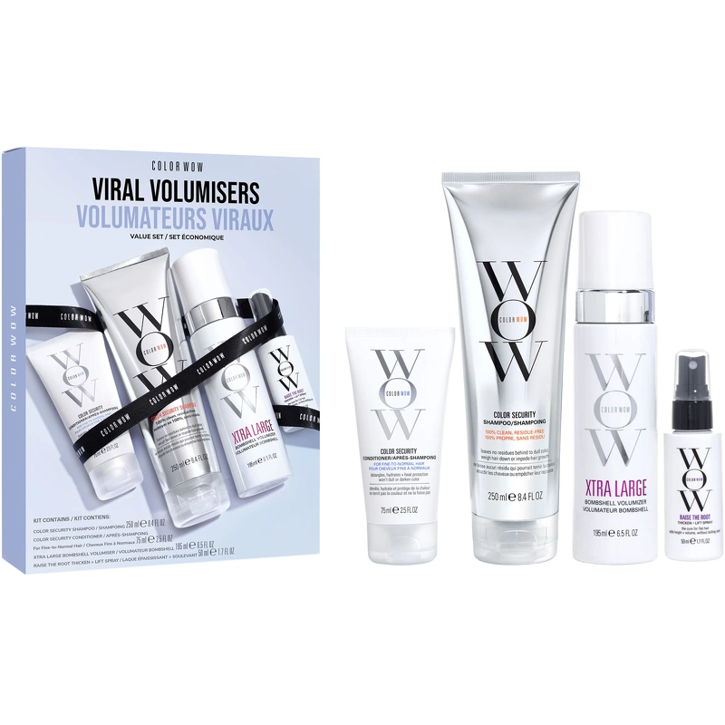 Color Wow Viral Volumisers är en presentask med lyxiga och effektiva hårprodukter som är perfekta för dig som vill ha antingen en mjuk, elegant look eller full volym som varar hela dagen. Setet innehåller: - 1 st. Color WOW Color Security Shampoo 250 ml - 1 st. Color WOW Color Security Conditioner FN 75 ml - 1 st. Color WOW Raise the Root Thicken + Lift Spray 50 ml - 1 st. Color WOW Bombshell Extra Stor 195 ml