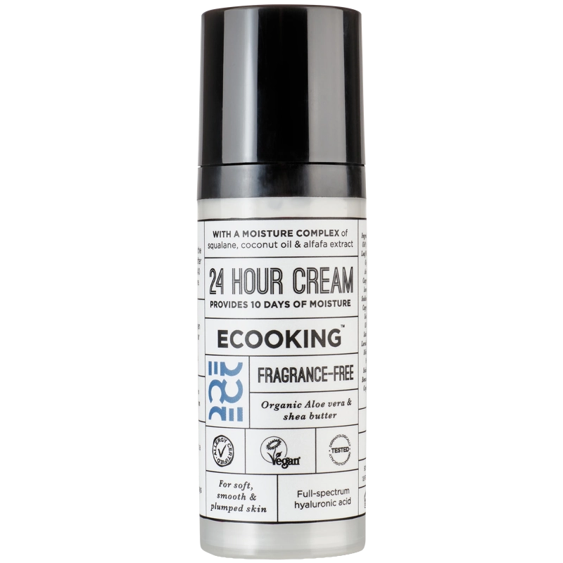 Med ECOOKING 24 Hour Cream Parfymfri kan fukten bibehållas i upp till 10 dagar. Hemligheten är ett fuktkomplex av squalan, alfalfaextrakt och kokosolja, som tillsammans ger denna ultraåterfuktande effekt. Det hjälper huden att behålla fukten, förbättrar hudens släthet och klarhet samt exfolierar huden skonsamt. Dessutom innehåller krämen fullspektrum hyaluronsyra, som verkar i alla hudlager och på kort tid lyfter och stramar upp huden, vilket minskar fina linjer. Ekologiskt sheasmör och gurkvatten återfuktar, lugnar och skyddar huden. Med 24 Hour Cream blir huden bortskämd med massor av fukt, förnyelse och mjukhet. Allergicertifierad, parfymfri, vegansk och dermatologiskt testad. Signaturingredienser: - Ny, fullspektrum hyaluronsyra, som är en avancerad hyaluronsyra som kan verka i alla hudlager för att ge huden en varsam och långvarig dos av fukt och fyllighet. På mycket kort tid förbättrar den hudens fasthet och elasticitet och minskar effektivt fina linjer. - Ett fuktkomplex av squalan, alfalfaextrakt och kokosolja arbetar på djupet för att återuppbygga hudens fuktbalans, så att den lär sig att behålla fukten själv. Denna återfuktande effekt varar i upp till 10 dagar och förbättrar hudens släthet, medan fuktkomplexet skonsamt exfolierar huden. - Organiskt sheasmör, som lugnar huden och bildar ett skyddande lager på huden som bevarar fukten. - Organiskt gurkvatten, som har lugnande, kylande och återfuktande egenskaper. Fördelar: - Dagkräm - Återfuktar huden i upp till 10 dagar - Förbättrar hudens släthet och klarhet - Hjälper huden att behålla fukten - Skonsamt exfolierande effekt - Lyfter och stramar upp huden - Minskar fina linjer - Lugnar och skyddar huden - Ger förnyelse och mjukhet - Parfymfri. vegansk, dermatologiskt testad och AllergyCertified Användning: - Applicera krämen på ansiktet morgon eller kväll efter att du har rengjort huden noggrant med din föredragna rengöring. Använd 1-2 pumptryck och massera försiktigt in i huden tills krämen är helt absorberad. - För extra fukt och fyllighet kan du applicera ECOOKING Hyaluronic Serum före krämen. Både Hyaluronic Serum och 24 Hour Cream innehåller fullspektrum hyaluronsyra, som binder fukt i alla hudlager och ger långvarig djupvård. - 24 Hour Cream ger upp till 240 timmars fuktvård, stärker hudens naturliga barriär och lämnar huden mjuk, smidig och välvårdad - Den är lämplig för alla hudtyper och regelbunden användning säkerställer att huden hålls optimalt återfuktad och välbalanserad. Ingredienslista: * Vatten Triticum Vulgare-groddolja * Glycerylstearat* Aloe Barbadensis-bladvatten Butyrospermum Parkii-smör Glycerin Cetearylalkohol * Stearinsyra Cucumis Sativus-fruktvatten * Kaprylylglykol* Squalen * Sackaridisomerat * Kokokaprylat/kaprat* Natriumlauroylglutamat * Tokoferol * Kapryl-/kaprintriglycerid Karbomer Natriumhyaluronat * Cocos Nucifera-olja * Glycerylkaprylat * Medicago Sativa-extrakt* Propandiol * Natriumlevulinat * Helianthus Annuus-fröolja* Dilinolsyra/butandiol-sampolymer Kaliumsorbat C9-12-alkan Natriumhydroxid Citronsyra Natriumbensoat Natriumcitrat* Ricinolja Olja/Ipdi-sampolymer**.