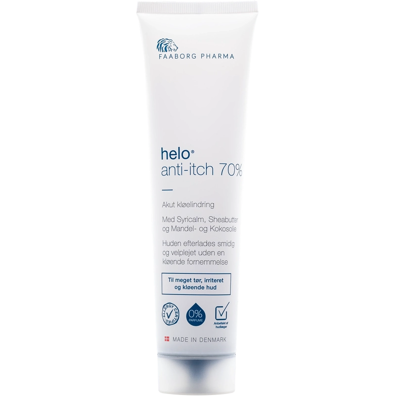 Faaborg Pharma Helo® Anti-Itch 70% Cream är en effektiv fettkräm som har en klådastillande och lugnande effekt på mycket torr, irriterad och kliande hud, och är lämplig för atopisk hud. Krämen innehåller klådastillande och lugnande syricalm, vilket lindrar obehag i samband med stressad, mycket torr, irriterad och kliande hud. Innehållet av sheasmör, mandel- och kokosolja, som är rik på vitamin E, har en skyddande, återfuktande och mjukgörande effekt samt en antioxidant effekt. Sheasmörets höga innehåll av fettsyror och vitaminer mjukgör huden och bidrar till läkning och lindring av t.ex. rodnad. Provitamin B5 påskyndar hudens naturliga läkning, har en fuktbindande effekt och minskar fuktförlust. Huden lämnas mjuk och välvårdad utan en klåda. Krämen kan användas dagligen vid behov av både barn och vuxna - eller som ett komplement till daglig fuktvård. Denna kräm är allergicertifierad, utan parfym och rekommenderas av hudläkare. Fördelar: - Fet kräm - För mycket torr, irriterad och kliande hud - Även lämplig för dig med tendens till atopisk hud - Klådstillande och lugnande - Återfuktar, ger näring, mjukgör och skyddar huden - Påskyndar hudens naturliga läkning - 70 % fettinnehåll - Kan användas av både vuxna och barn - Allergicertifierad - Utan parfym - Rekommenderas av hudläkare Användning: - Kan användas för hela kroppen och för områden som känns särskilt kliande och/eller är röda/irriterade - Använd gärna krämen några minuter efter ett bad, när huden är mottaglig för vård. Våt hud är särskilt benägen att torka ut och kan klia mer - Använd dagligen vid behov av både barn och vuxna - eller som ett komplement till daglig återfuktande vård - Tips: Använd en återfuktande kräm med hög fetthalt 1-2 gånger om dagen för att förhindra torr hud. Ingredienslista: Paraffinum Liquidum (fettgivande), Aqua (vatten), Cocos Nucifera (kokosolja), Prunus Amygdalus Dulcis Oil (mandelolja), Butyrospermum Parkii Butter (fettgivande och emulgerande), Stearinsyra (fettgivande och emulgerande), Glycerylstearat (fettgivande och emulgerande), Panthenol (rekonstruerande), Trietanolamin (emulgerande), Phragmites Kharka Extract (klådadämpande), Fenoxietanol (konserveringsmedel).