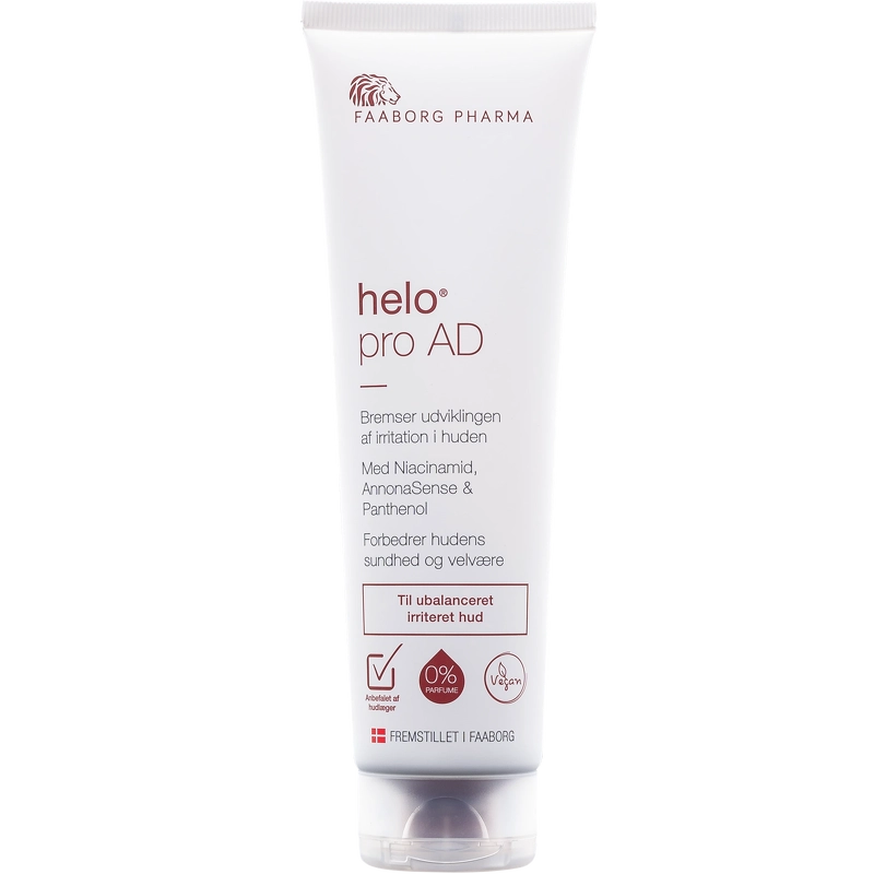 Faaborg Pharma Helo® Pro AD är en kräm som stoppar utvecklingen av irriterad och kliande hud, med tendens till atopisk hud, och förbättrar hudens hälsa och välbefinnande. Lämplig för svåra fall av mycket irriterad hud. Krämen innehåller Anonasense, vilket hjälper huden att återfå sin egen läkningsförmåga, samt minskar och hjälper inflammatoriska processer. Niacinamid (vitamin B3) stärker hudens eget försvar, medan Actibiome stärker hudens egen bakterieflora. Kokosolja förbättrar hudens naturliga elasticitet, är rik på E-vitamin och har en skyddande, återfuktande och mjukgörande effekt. Panthenol (vitamin B5) påskyndar naturlig läkning, har en fuktbindande effekt och minskar fuktförlusten i huden. Denna kräm bör användas flera gånger om dagen vid behov i 1-2 veckor som ett komplement till till exempel helo-kräm, för att återställa hudens naturliga balans. Krämen är också både allergicertifierad, parfymfri och rekommenderad av hudläkare. Fördelar: - Kräm - För irriterad och kliande hud, med tendens till atopisk hud - Stoppar utvecklingen av irriterad och kliande hud - Återfuktar, mjukgör och skyddar - Stärker hudens naturliga elasticitet - Accelererar hudens naturliga läkning - Stärker hudens eget försvar och bakterieflora - Förbättrar hudens hälsa och välbefinnande - Lämplig för svåra fall av mycket irriterad hud - Vegansk - Allergicertifierad - Utan parfym - Utvecklad och rekommenderad av hudläkare Användning: - Använd flera gånger om dagen vid behov i 1-2 veckor - Bör användas som komplement till t.ex. Helo® Cream, för att återställa hudens naturliga balans - Kan appliceras direkt efter badet, medan huden fortfarande är lätt fuktig, så att krämen lättare tränger in i huden Ingredienslista: Vatten, paraffinum liquidum, cocos nucifera-olja, panthenol, annona cherimola fruktextrakt, niacinamid, cetylalkohol, glycerylstearat, PEG-75-stearat, kaliumsorbat, steareth-20, ceteth-20, maris aqua, glycerin, citronsyra, laminaria digitata-extrakt, 2-fenoxietanol, chlorella vulgaris-extrakt, sackaridisomerat, etylhexylglycerin.