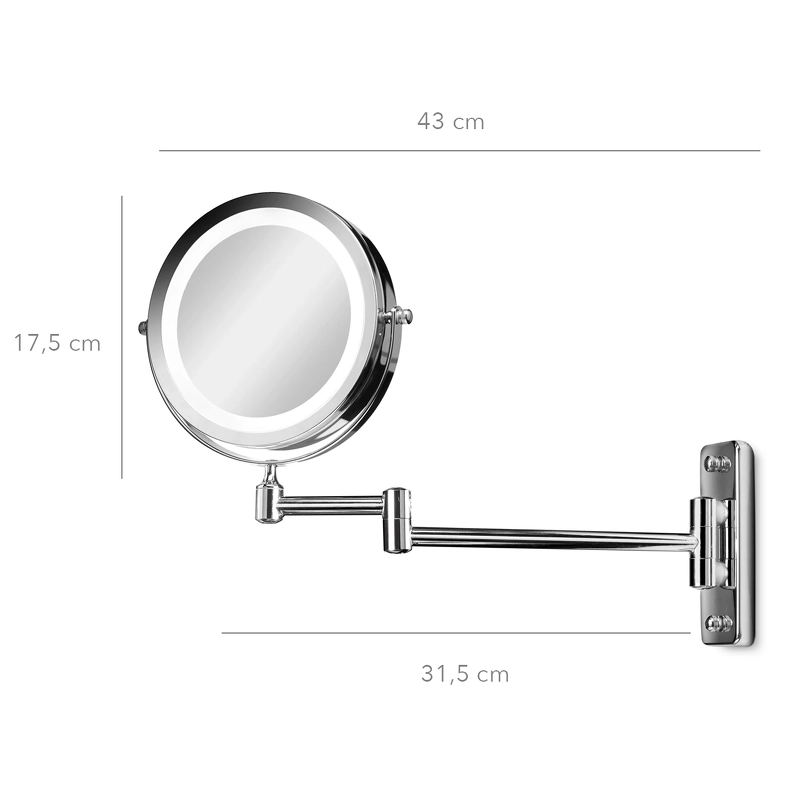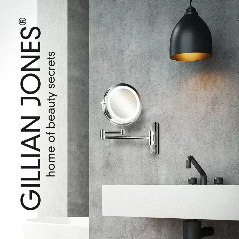 Gillian Jones Wall Mirror m/ Arm & Lights är en superfunktionell och praktisk spegel, som har utvecklats med ett inbyggt och runt LED-ljus, för att ge bästa möjliga spegelbild. Spegeln är lätt att montera på väggen, och den inbyggda 'armen' gör att du kan dra spegeln upp till 31 cm. ut och sätt den ända in till väggen när den inte används. Spegeln är dubbelsidig med 1x förstoring på ena sidan och 10x förstoring på den andra, och kan vridas 360 grader. Med denna spegel är det mycket lättare att lägga den perfekta sminken, där du kan specificera även de minsta detaljerna. Detaljer: - Spegel - Inbyggt LED-ljus - Lätt att montera på väggen - Kan dras ca. 31 cm från väggen - Dubbelsidig med 1x och 10x förstoring - Kan vridas 360 grader - 17,5 cm. i diameter - Kräver 4 x AAA-batterier (ingår ej)