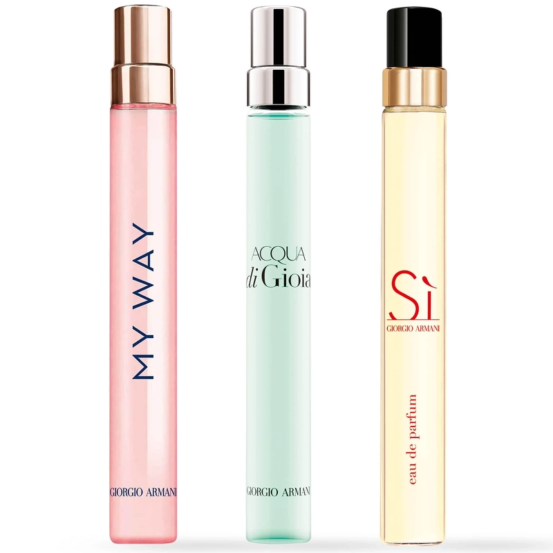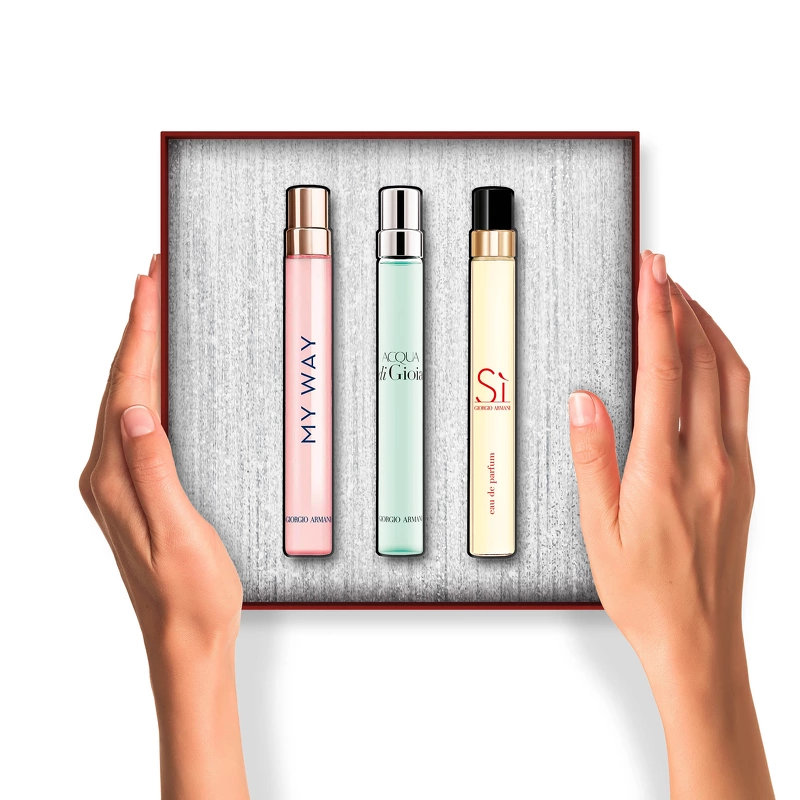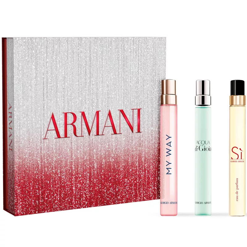 Giorgio Armani Miniature For Her Gift Set (Limited Edition) är ett måste för dig som älskar Armani. Den här julen presenterar Armani en exklusiv presentask i röda och silvertoningar, innehållande tre av deras mest ikoniska feminina dofter. Trio Holiday-setet innehåller My Way Eau de Parfum, Acqua di Gioia Eau de Parfum och Sì Passione Eau de Parfum, var och en i 10 ml-format. My Way erbjuder lysande blommiga bärnstensnoter med apelsinblomma och tuberos. Acqua di Gioia ger en vattenliknande fräschör med citron och jasmin. Sì Passione uttrycker djärv passion med ros, jasmin och svarta vinbär. Perfekt som present eller för resor, denna mångsidiga trio låter kvinnor utforska Armanis mest älskade doftsignaturer. Setet innehåller: - 1 st. Giorgio Armani My Way EDP 10 ml - 1 st. Giorgio Armani Acqua Di Gioia EDP 10 ml - 1 st. Giorgio Armani Sì Passione EDP 10 ml