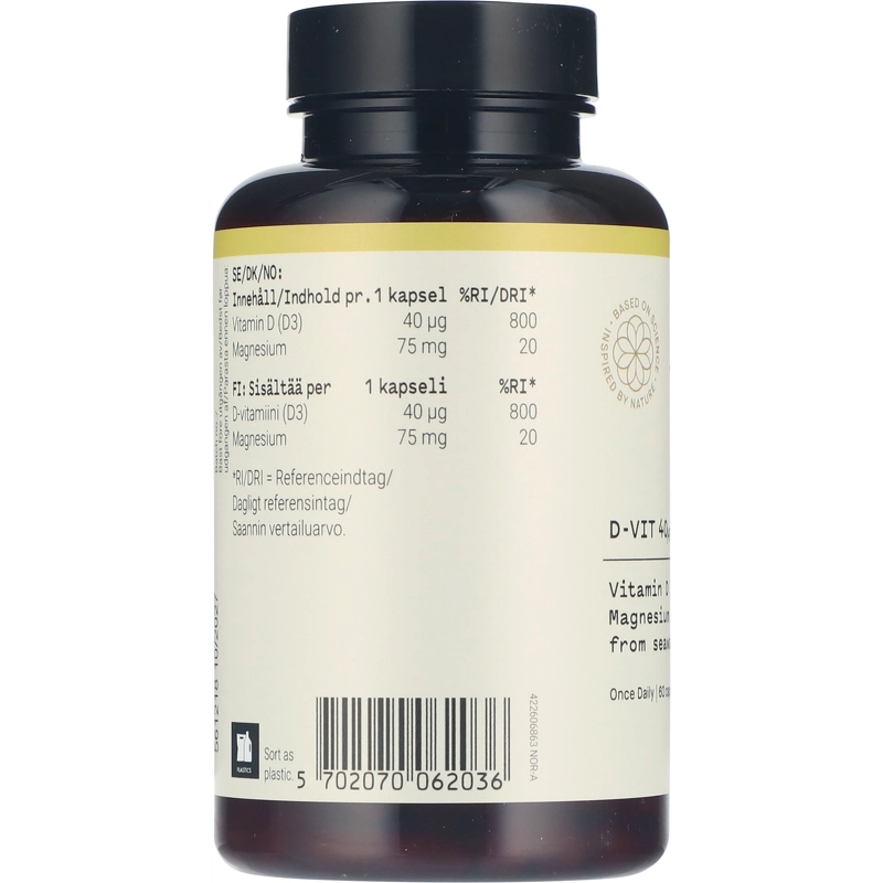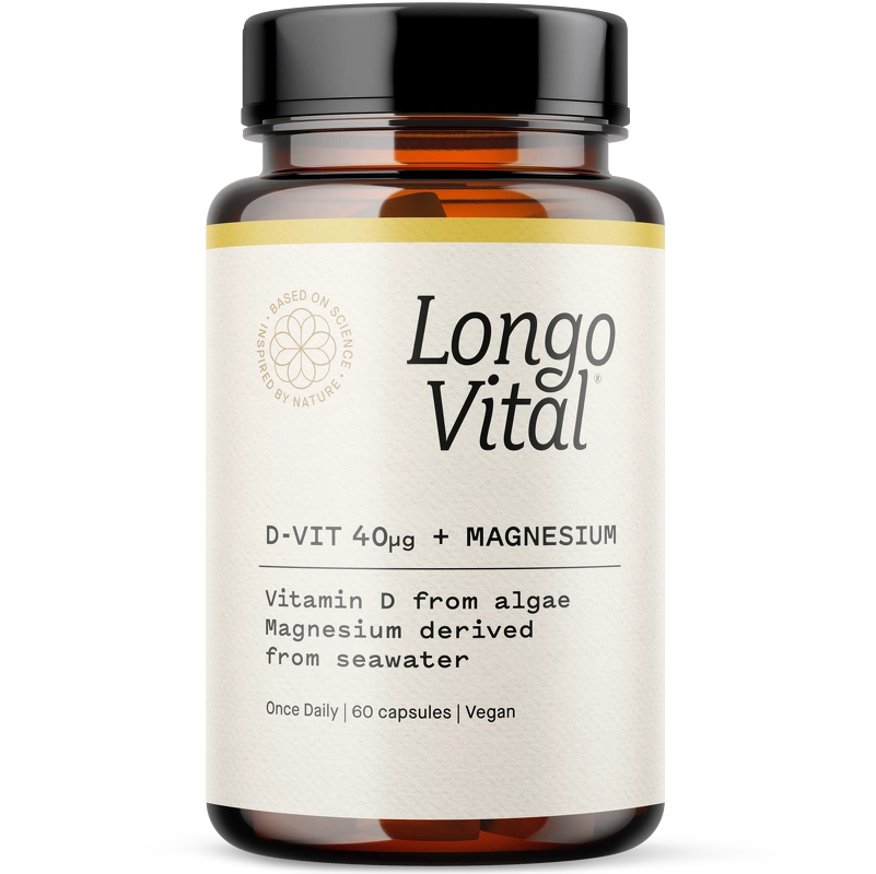 LongoVital D-Vit 40 + Magnesium 60 stycken är ett kosttillskott som kombinerar vitamin D från alger och magnesium från havsvatten, vilket ger dig en produkt baserad på veganska källor. Detta kosttillskott kan användas av alla som vill ha ett enkelt tillskott. Vitamin D bidrar till att bibehålla normal benstomme och normal muskelfunktion, medan magnesium hjälper till att minska trötthet och utmattning och samtidigt stödjer normal muskelfunktion. Fördelar: - Kosttillskott - Med vitamin D och magnesium - För vuxna över 18 år - Innehåller 60 kapslar - Vegansk Rekommenderad daglig dos: - 1 kapsel dagligen för vuxna över 18 år - Bör sväljas hel - Den rekommenderade dagliga dosen bör inte överskridas Näringsinnehåll per daglig dos (1 kapsel): - Vitamin D (D3) 40 µg - Magnesium 75 mg OBS: Den rekommenderade dagliga dosen bör inte överskridas. Kosttillskott bör inte ersätta en varierad kost. Förvaras torrt vid högst 25°C och utom räckhåll för barn. Ingredienslista: Fyllnadsmedel (cellulosagel), magnesium, vegetabilisk kapsel (hydroxipropylmetylcellulosa), vitamin D (D3).