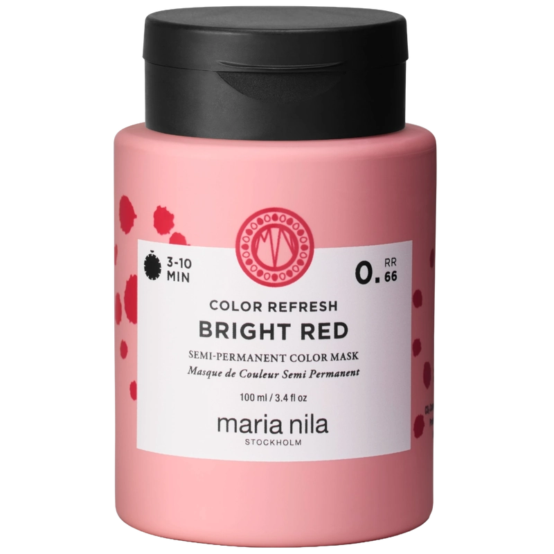 Maria Nila Color Refresh - 0,66 Bright Red är en närande och närande hårkur som är helt perfekt för dig som vill fräscha upp din hårfärg eller prova nya toner . Den kan användas ensam eller blandad med andra Maria Nila Colour Refresh-kurer, och därigenom kan du skapa din egen unika färg. Om du vill göra färgen ljusare kan du blanda den med Maria Nila Colour Refresh 0,00 White Mix. Den kan användas i både färgat och naturligt hår, men det mest intensiva resultatet uppnås i färgbehandlat hår. Detta är inte en permanent hårfärg och täcker alltså inte grått hår. Den innehåller dock pigment vilket gör att den gradvis kommer att försvinna från håret under hårtvätt. Vill du fräscha upp din hårfärg som om du kom direkt från frisören, samtidigt som håret vårdas, då är Maria Nila Color Refresh rätt val! Det rekommenderas inte att få en mörk färg i ljust eller upplyst hår och dessutom kommer en effektfärg/färgbomb inte heller att kunna ljusa upp håret och du kommer därför inte att uppnå någon effekt genom att välja en färg som är ljusare än din egen hårfärg. Det är individuellt hur färgen bleknar från person till person och normalt försvinner färgen efter 4-10 hårtvättar, dock kan detta variera beroende på hårets kvalitet, dragtid, färg, tidigare behandlingar etc. Fördel: - Vårdande effektfärg - Kan användas i både naturligt och färgat hår - Närande - Lysande - Kan blandas med andra Maria Nila Colour Refresh-färger - Fräschar upp din hårfärg - Täcker inte grått hår - Rymmer 4-10 hårtvättar - Berikad med arganolja - Vegan - OBS. Engångshandskar kan köpas separat Ansökan: - Testa alltid färgen på en enda tota innan du använder den i hela håret - Bär alltid handskar - Applicera produkten i fuktigt hår - Kamma igenom håret för att fördela färgen - Låt verka i 3-10 minuter, beroende på önskad intensitet - Skölj håret noggrant med vatten och avsluta med balsam