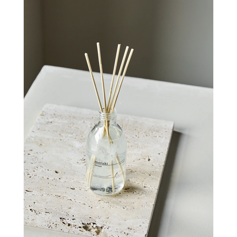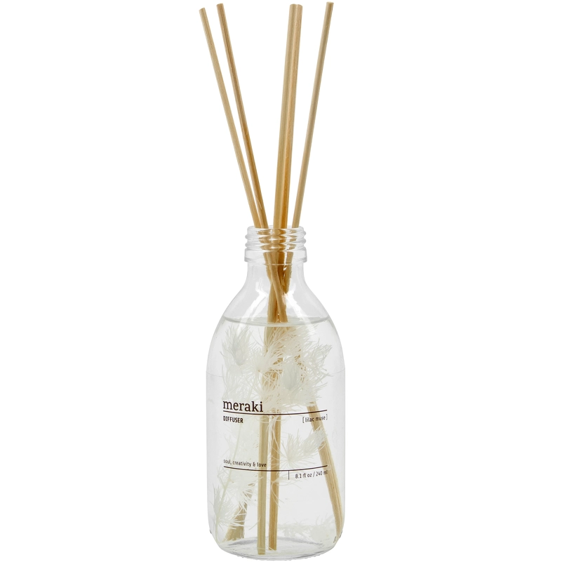 Meraki Diffuser - Lilac Muse är en elegant doftspridare med milda blommiga noter som syren och jasmin, som blandas med en varm och djup bas. Doften består av toppnoter av jasmin och syren, hjärtnoter av ylang-ylang, viol, ros och lavendel, samt basnoter av mysk, cederträ, vanilj och heliotrop. Doftspridaren kommer i en snygg och klar glasflaska med naturliga doftpinnar som passar perfekt in i alla rum där du vill tillföra en behaglig doft och atmosfär. Fördelar: - Doftspridare - Snygg och klar glasflaska - Mild blommig doft med en varm och lugnande bas - Toppnoter: jasmin och syren - Hjärtnoter: ylang-ylang, viol, ros och lavendel - Basnoter: mysk, cederträ, vanilj och heliotrop - Tillverkad i Europa - Mått: ca 26 x 5,6 cm Användning: - Ta bort locket och sätt in pinnarna i flaskan - Minska vid behov antalet pinnar om du vill ha en mindre stark doft - Vänd pinnarna regelbundet för att uppdatera doften Ingredienslista: Linalool; 1-(1,2,3,4,5,6,7,8-oktahydro-2,3,8,8-tetrametylnaftalen-2-yl)etan-1-on; 4-(2,6,6-trimetylcyklohex-2-en-1-yl)-but-3-en-2-on; α-hexylcinnamaldehyd; 4-tert-butylcyklohexylacetat; Eugenol; Korianderolja; Bensylsalicylat; Ättiksyralinalylester; Citronellol; Apelsin, söt, extrakt; Ylang-ylangolja; 3,7-dimetylnona-1,6-dien-3-ol; Kumarin; Indol; Metylsalicylat; Metylnon-2-ynoat.