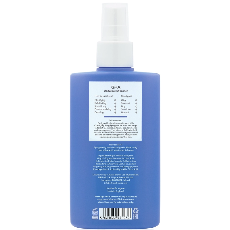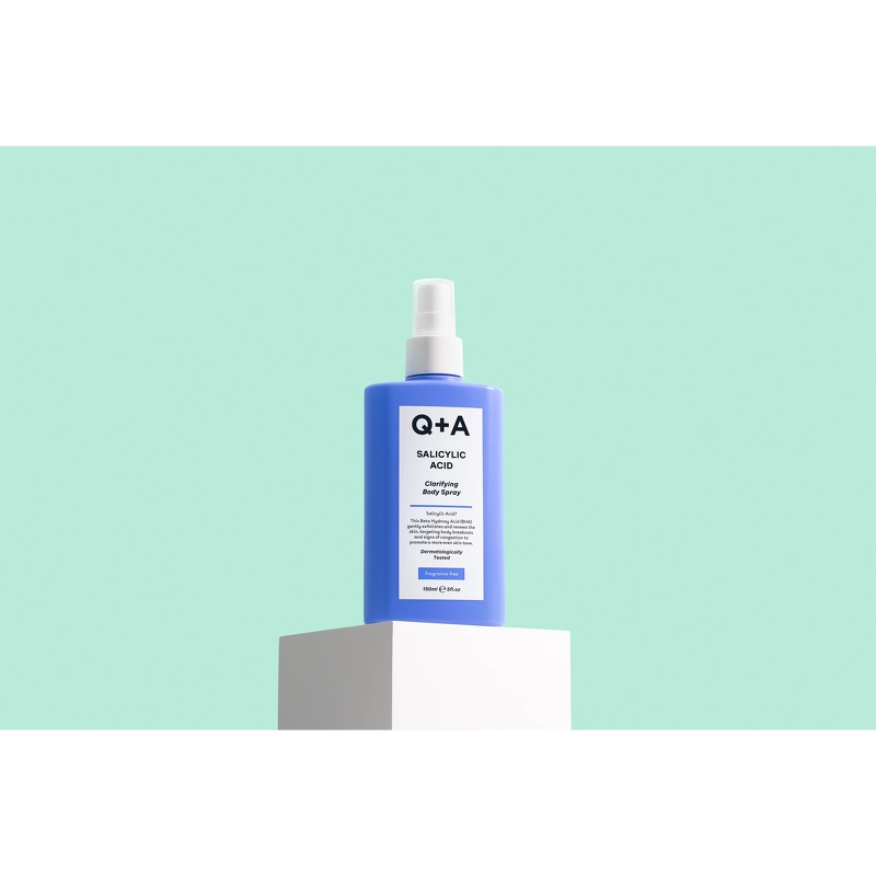 Q+A Salicylsyra Clarifying Body Spray är en kroppsspray med salicylsyra som effektivt lugnar, rengör och slätar ut huden utan att störa hudbarriären. Sprayen arbetar mot orenheter på kroppen och når lätt svåra områden och hjälper till med allt från "bacne"-orenheter på ryggen till finnar på huden - "jordgubbshud". Den praktiska sprayen är perfekt att använda på språng och efter träning, och är formulerad med exfolierande salicylsyra, balanserande bärnstenssyra och lugnande aloe vera för att ge en slätare och synbart klarare hud. Viktiga ingredienser SalicylsyraEn fettlöslig BHA-syra som löser upp döda hudceller och minskar talgproduktionen. Salicylsyra exfolierar huden på ytan och löser upp blockeringar i porerna som leder till orenheter. En antiinflammatorisk ingrediens, särskilt bra för fet och oren hud, men även för ojämn hudstruktur. Bärnstenssyra: En växtbaserad aktiv ingrediens utvunnen ur majsstärkelse. Bärnstenssyra hjälper huden att bli av med döda hudceller, exfolierar skonsamt, rengör porerna och balanserar talgproduktionen. Aloe vera: Känd för sina lugnande egenskaper som lugnar stressad hud och ger komfort, samtidigt som den fungerar som en naturlig fuktighetskräm som tillför och bevarar fukt i huden över tid. Salicylsyra Body Spray är lämplig för känslig, fet, stressad och normal hud. Dermatologiskt testad. 98% naturliga ingredienser. Fördelar: - Bodyspray med salicylsyra - Lugnar, rengör och slätar ut huden - Verkar mot orenheter på kroppen - Når lätt svåra områden - Hjälper mot "bakterier" och finnar på huden - Praktisk spray för användning på språng och efter träning - Innehåller exfolierande salicylsyra - Balanserar huden med bärnstenssyra - Lugnar med aloe vera - Gör huden lenare och synbart klarare - Lämplig för känslig, fet, stressad och normal hud - Dermatologiskt testad - 98% naturliga ingredienser - Vegansk. Alkoholfri. Parfymfri Bruksanvisning: - Spraya jämnt på ren, torr hud och låt absorberas helt - Använd fuktighetskräm om så önskas - Använd dagligen för bästa resultat