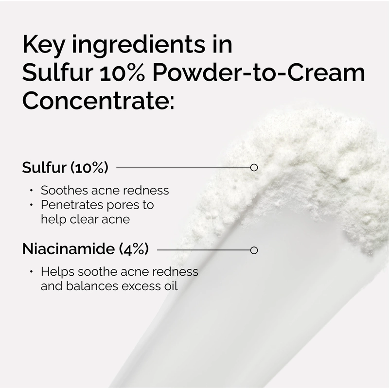 Ordinary Sulfur 10% Powder-to-Cream Concentrate är en riktad behandling för de som kämpar med blemmor och utbrott. Behandlingen hjälper till att minimera uppkomsten av finnar vid applicering och ger synliga resultat på under 1 timme. Formulerad med 10% svavel för att minska uppkomsten av blemmor och utbrott. Svavel är en mild ingrediens som riktar sig mot blemmor, vilket gör den idealisk för personer med känslig hud. Formulan använder kolloidalt svavel, som har en mindre partikelstorlek för att ge effektiv leverans. Denna produkt har en unik puder-till-kräm-konsistens. Puderformatet möjliggör exakt produktapplicering och är lätt att använda när du är på språng. När du applicerar produkten i puderformat förvandlas pudret till en punktkräm som diskret smälter in i huden. Tester visar: - Finnreducering: Minskar uppkomsten av finnar på under 1 timme. - Synlig rodnad: Minimerar synlig rodnad med 50% på bara 1 timme - Oljekontroll: Börjar absorbera överflödig olja för att minska synlig glans vid applicering *Kliniskt testad på 30 försökspersoner efter en enda applicering. Fördelar: - Punktbehandling - Minskar uppkomsten av finnar och blemmor - Minimerar synlig rodnad - Absorberar överflödig olja - Med 10 % kolloidalt svavel - Även idealisk för känslig hud - Puder-till-kräm-konsistens, smälter in i huden - Exakt produktapplicering - Lätt att använda när du är på språng Bruksanvisning: - Applicera en liten mängd puder på ett rent finger och applicera direkt på blemmet - Gnugga in i huden - Skölj inte - Använd inte på skadad hud - För nya användare: Börja med en applicering dagligen för att testa känsligheten. Om inget obehag uppstår, öka gradvis användningen av produkten - Vid torrhet eller fjällning, minska användningen till en gång dagligen eller varannan dag - Endast för utvärtes bruk. Rådfråga läkare före användning om du har svår akne - Hudirritation och torrhet kan uppstå oftare om du använder flera akneprodukter samtidigt - Om irritation uppstår, använd endast en produkt åt gången. Sluta använda och kontakta läkare om ingen förbättring ses inom 6–8 veckor - Förvaras utom räckhåll för barn - Vid förtäring, kontakta Giftinformationscentralen eller sök omedelbart läkarvård - Undvik kontakt med ögonen. Skölj noggrant med vatten vid kontakt - Använd endast på områden med akne - Använd inte på skadad hud eller stora hudområden - Sluta använda och kontakta läkare om allvarlig irritation, sveda eller klåda uppstår - Mild sveda eller klåda kan uppstå vid applicering - Undvik att andas in pulvret - Rådfråga läkare före användning om du är gravid eller ammar Ingredienslista: GLYCERIN, PROPANEDIOL, KISELSILYLAT (NANO), SVAVEL, AQUA/VATTEN/EAU, KARNITIN, NIACINAMID, ACACIA SENEGALGUMMI, KAOLIN, POLYLYSIN, CITRONSYRA, NATRIUMCITRAT, ETYLHEXYLGLYCERIN, FENOXYETANOL, KLORFENESIN · Observera att ingredienslistor kan ändras eller variera från tid till annan. Se ingredienslistan på produktförpackningen du får för den mest aktuella ingredienslistan.