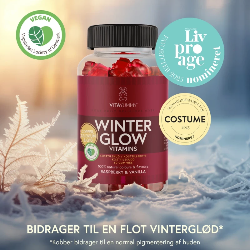 VitaYummy Winter Glow Raspberry Vanilla ser till att kyla och mörker inte lämnar sina spår på din hud, och ger dig istället en strålande lyster som börjar inifrån och varar hela vintern. Dessa unika vitaminnallar är skapade för att ge näring, skydda och förnya din hud, så att du kan möta de kalla månaderna med självförtroende och fräschör. Nallarna innehåller koppar, vilket bidrar till naturlig hudpigmentering, medan selen och vitamin E skyddar cellerna från oxidativ stress - perfekt för att bekämpa vardagens påverkan. Q10, en älskad ingrediens i hudvård, ger en extra boost, och zink och biotin säkerställer att hudens naturliga balans och hälsa bibehålls. Samtidigt stärker vitamin C och D ditt immunförsvar, så att du kan möta vintern med kraft. Med sin läckra hallon- och vaniljsmak är VitaYummy Winter Glow ett sant nöje i din dagliga rutin. Den naturliga färgen från morot och svarta vinbär gör den inte bara inbjudande, utan stöder också dess rena profil - vegansk och fri från artificiella tillsatser. Unna dig VitaYummy Winter Glow och njut av en vinter full av lyster och välbefinnande! Fördelar: - Kosttillskott - Avsedd för vuxna över 18 år - Bidrar till normal hudpigmentering - Skyddar cellerna mot oxidativ stress - Bidrar till normal hud och normala slemhinnor - Bidrar till immunsystemets normala funktion Rekommenderad daglig dos: - 2 st per dag - Avsedd för personer över 18 år - Burken innehåller 60 gummies motsvarande 30 portioner Ingredienslista: Glukossirap, socker/socker, geleringsmedel/geleringsmedel (pektin), vitamin C (L-askorbinsyra), syra/syra (citronsyra), naturlig arom/arom (hallon och vanilj/hallon och vanilj), vit. E (DL-alfa-tokoferylacetat), koppar (kopparglukonat), morotskoncentrat, svartvinbärskoncentrat, zink (zinkcitrat), ytbehandlingsmedel (vegetabilisk olja (kokosnöt, raps)), biotin (D-biotin), koenzym Q10 (ubidekarenon), ytbehandlingsmedel (karnaubavax), selen (natriumselenat), vitamin D3 (kolekalciferol). OBS: Förvaras torrt, i rumstemperatur och skyddat från direkt solljus. Förvaras utom räckhåll för barn. Den dagliga dosen får inte överskridas. Kosttillskott bör inte ersätta en varierad kost. Bör endast användas av gravida kvinnor och barn efter samråd med läkare eller vårdcentral.