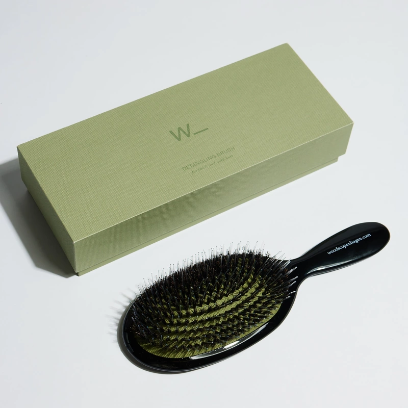 Woods_Copenhagen Detangling Brush är en borste som bekämpar envisa knutar och tämjer friss och ostyriga lockar. Denna borste är utvecklad med en ikonisk blandning av vildsvinsborst och nylon, vilket förbättrar hårstråets kvalitet och effektivt borstar igenom tjockt, grovt och lockigt hår utan att skada hårstrået. Borsten stimulerar blodcirkulationen i hårbotten för att främja en hälsosam hårväxt, medan borsten jämnt fördelar hårets naturliga, närande oljor från rot till topp. Ditt hår lämnas stärkt, skyddat och med ett mjukt, glansigt utseende. Fördelar: - Hårborste - Idealisk för tjockt, grovt och lockigt hår - Kombination av vildsvinsborst och nylonborst - Stimulerar blodcirkulationen i hårbotten - Fördelar hårbottens naturliga oljor i håret - Gör håret mer glansigt - Borstar effektivt och skonsamt genom håret - Tämjer frissighet - Skadar inte hårstråna Användning: - Borsta från topparna upp mot rötterna med lätta drag - Avsluta med att långsamt massera hårbotten och borsta från rot till topp för att fördela hårets naturliga oljor, vilket främjar ett glansigt och fylligt resultat